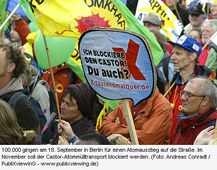 Über den weiteren Fahrplan der Anti-AKW-Bewegung schreibt das Bündnis der Anti-Atom-Demo vom 18. September auf seiner Webseite: »Es wird in den nächsten Wochen zahlreiche örtliche, regionale und landesweite Aktionen geben. So am 29. September in Salzgitter, am 6. Oktober in Stuttgart und am 9. Oktober in München. Unmittelbar vor der geplanten Verabschiedung der geplanten Atomgesetz-Novelle findet am 23. Oktober die nächste bundesweite Aktion statt, der Castor-Strecken-Aktionstag: Die Atomtransporte verbinden uns alle und jeder kann in der Nähe seines Wohnortes ein Zeichen setzen. Anfang November sollen dann wieder Castoren nach Gorleben rollen. Ein breites Bündnis ruft auf, noch bevor der Castor kommt, mit Kind und Kegel in Dannenberg zu demonstrieren. Das wird nach Lage der Dinge am 6. November sein, wenn gleichzeitig eine Großveranstaltung des DGB in Hannover stattfindet. Beide Aktionen werden kooperieren, nicht konkurieren, ein RednerInnen-Austausch ist abgesprochen. Und auch wenn die Castoren dann rollen, werden mehr Menschen im Wendland sein als jemals zuvor. Erstmals findet z.B. aus der Atomülllager-Region rund um Braunschweig (Morsleben (ERAM), Schacht Konrad, Asse II) ein gemeinsamer Treck ins Wendland und ein gemeinsames Camp statt. In Rheinland-Pfalz finden einige Anti-Atom-Montagsspaziergänge statt und weitere sind geplant.«